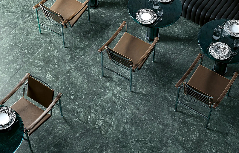Brutus дополнен керамогранитом, имитирующим гватемальский мрамор, а также роскошной настенной плиткой с глянцевой поверхностью Cromo. Cromo, благодаря глазури из драгоценных металлов, воссоздает эффект хромированной стали.