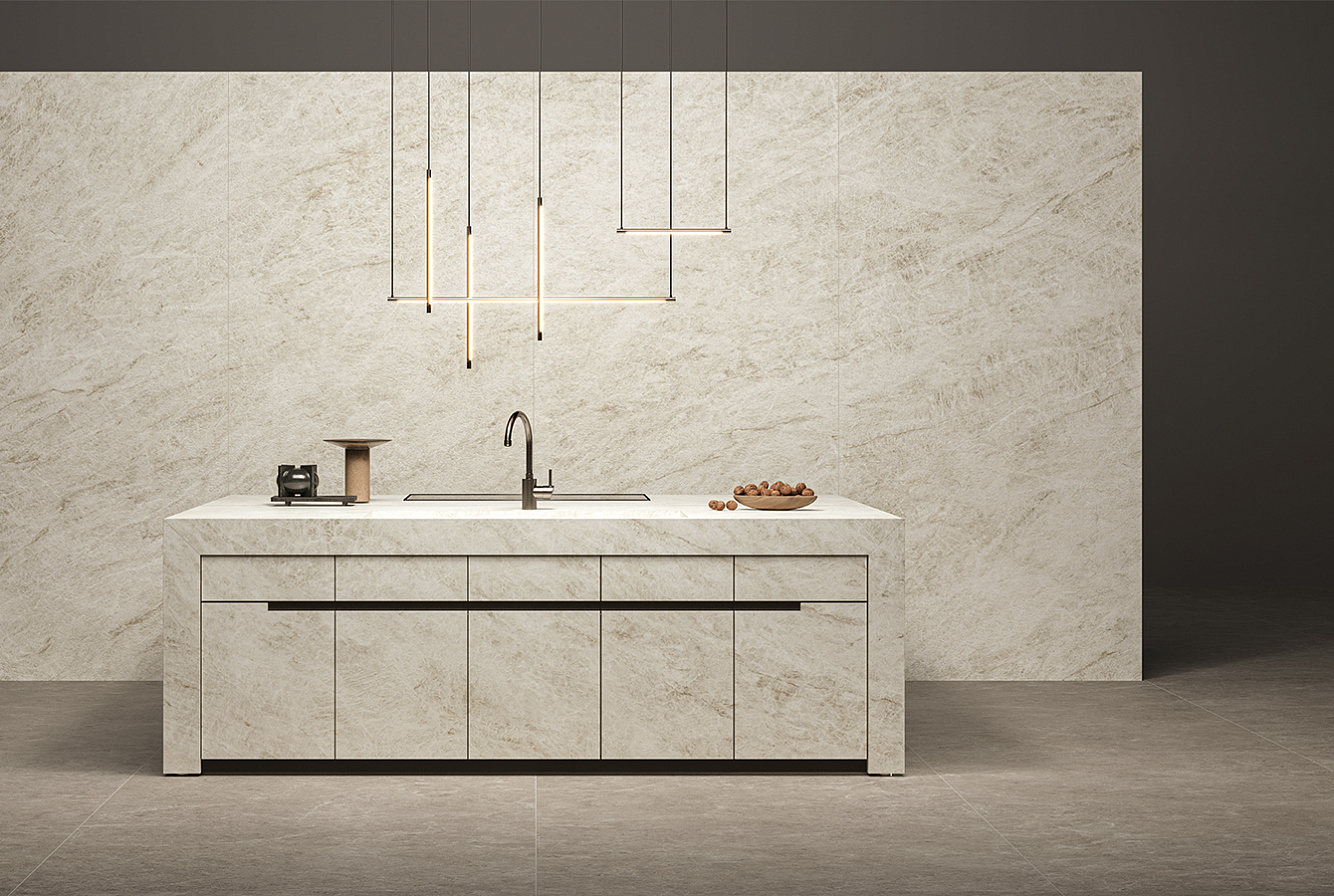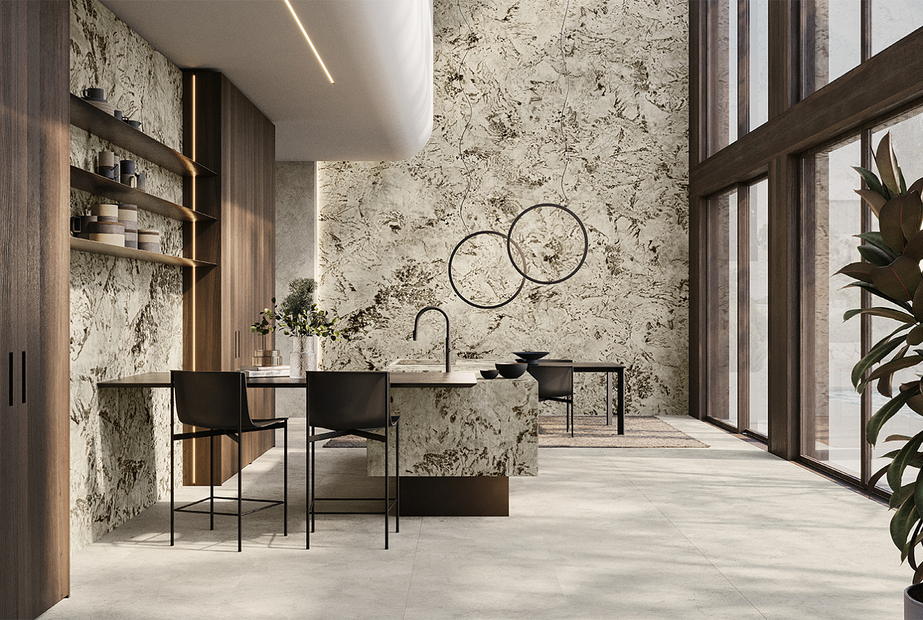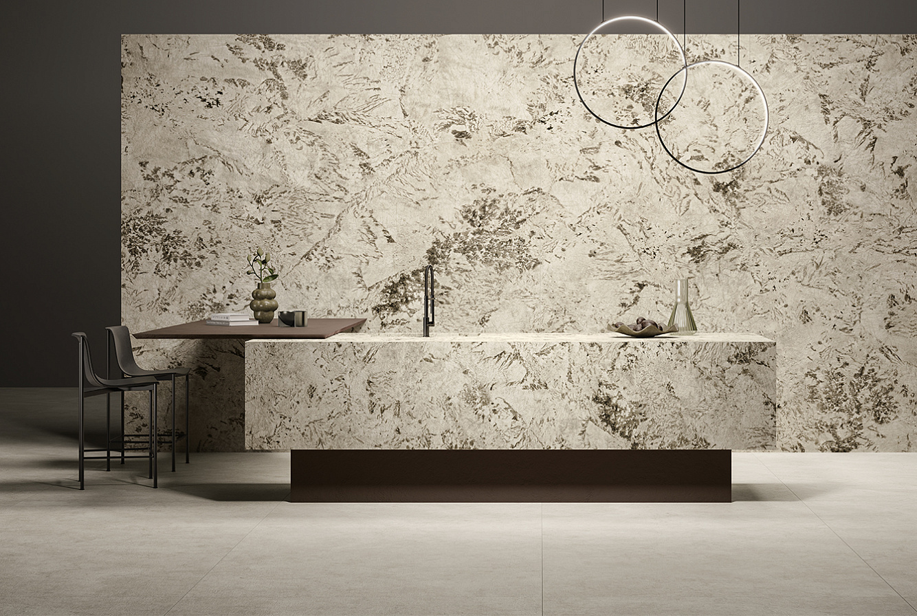 Alpinus, вдохновленный заснеженными горами, представлен теплыми белыми тонами с кристаллическими текстурами и деликатными вкраплениями цвета мокко;