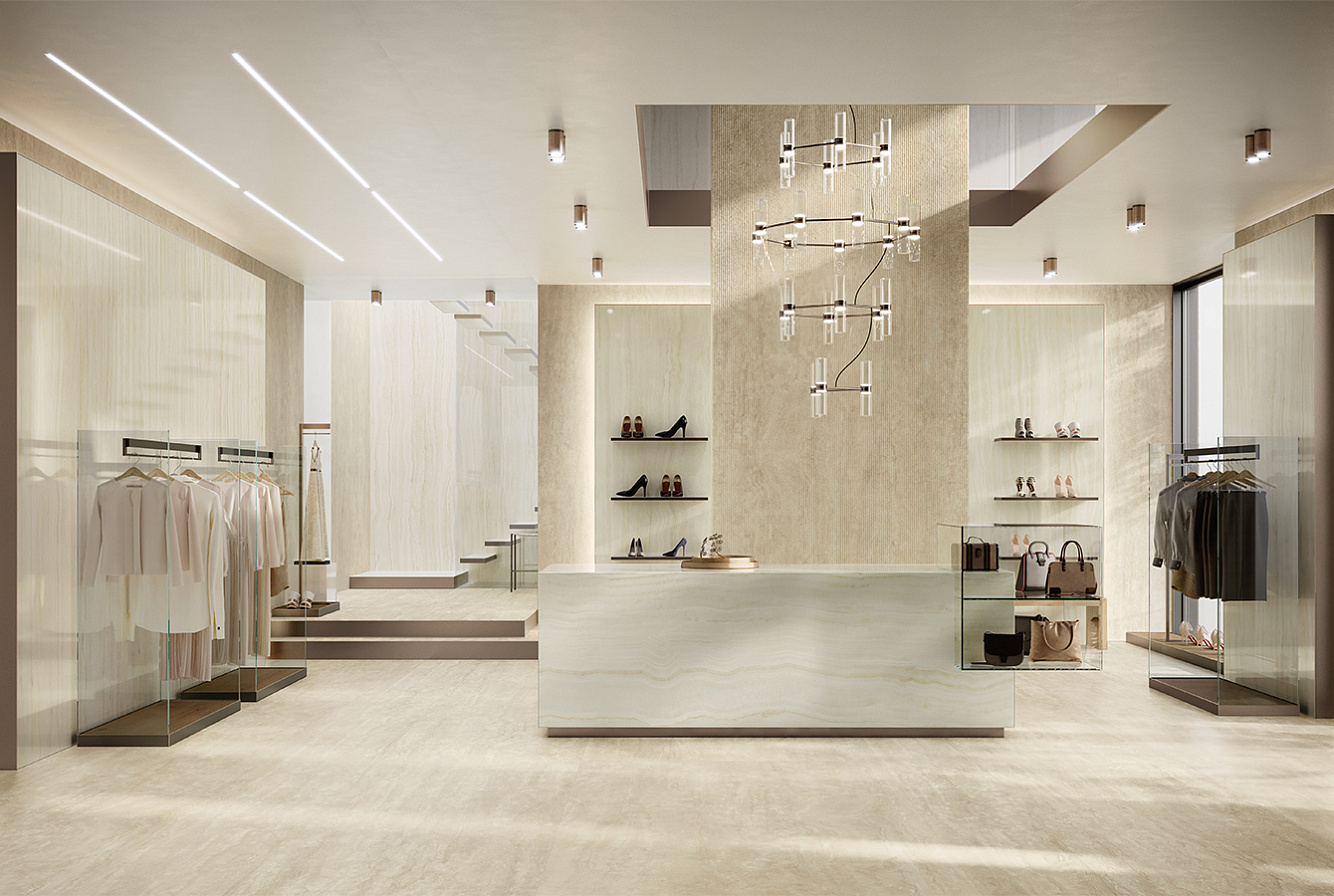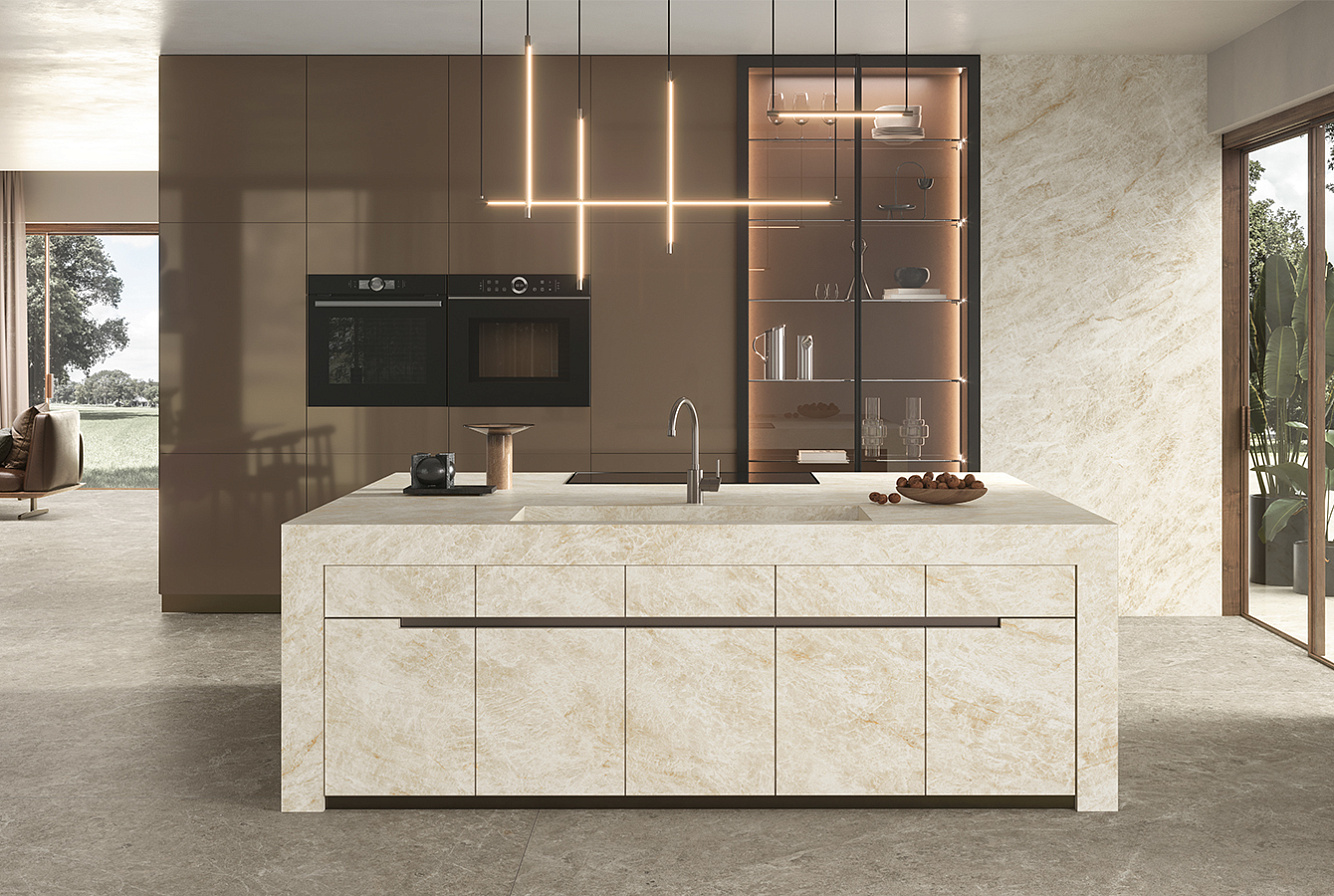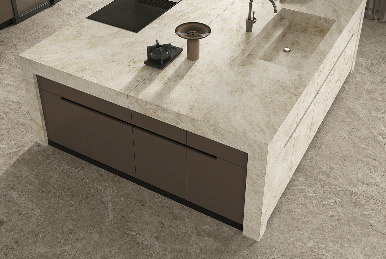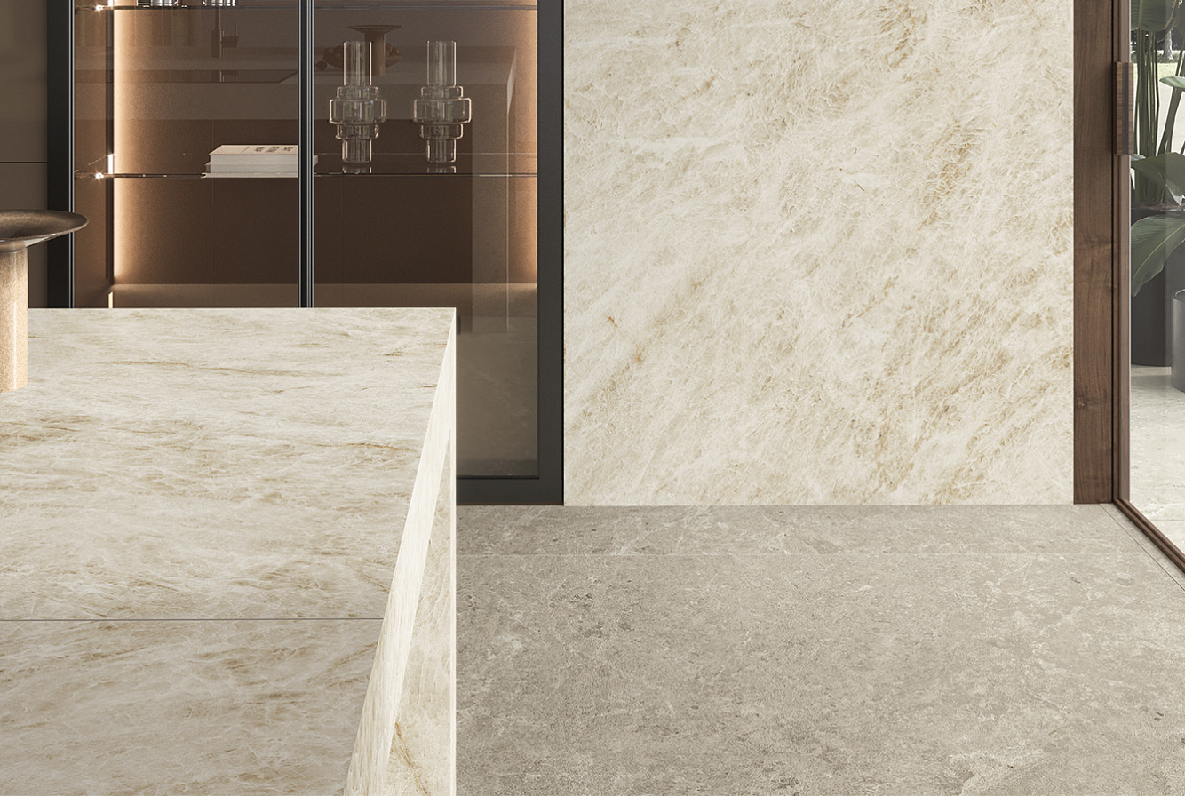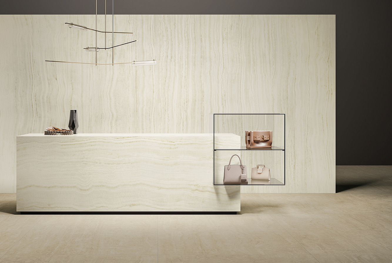 Onyx Ivory интерпретирует элегантность натурального оникса с прожилками цвета слоновой кости и мёда на тонко текстурированном фоне;