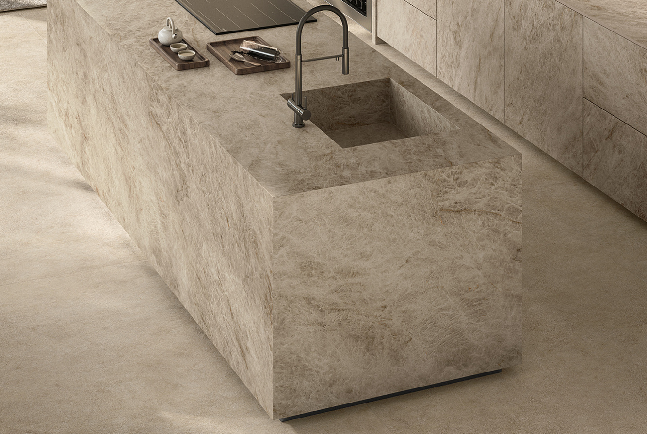 Taj Mahal White представляет собой более светлую интерпретацию легендарного камня с тёплыми тонами и изящными прожилками;