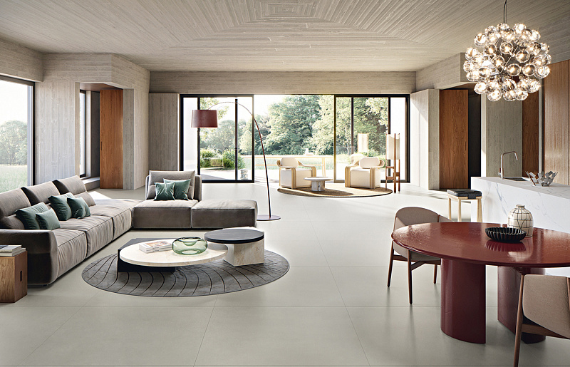Керамогранит выпускается в нескольких популярных форматах: 60x120 см, 80x80 см, 120x120 см, а также в МАКСИ‑формате 120x278 см (толщина материала — 6 мм).