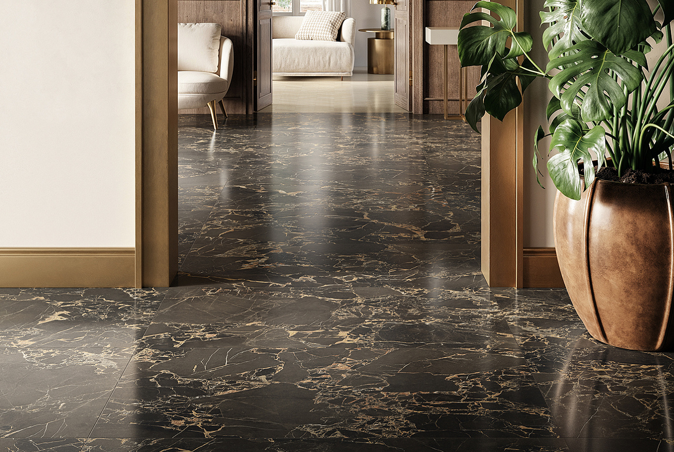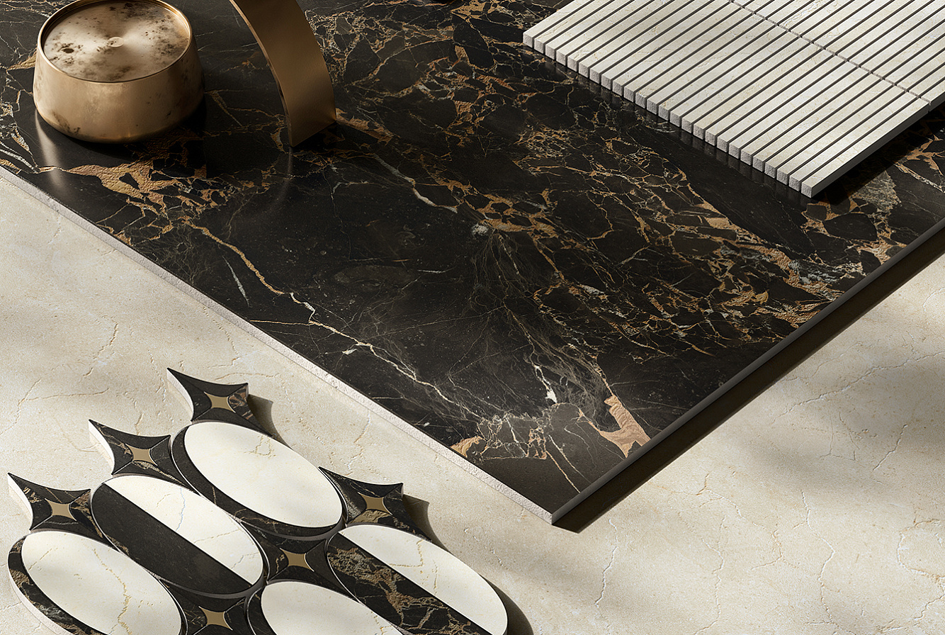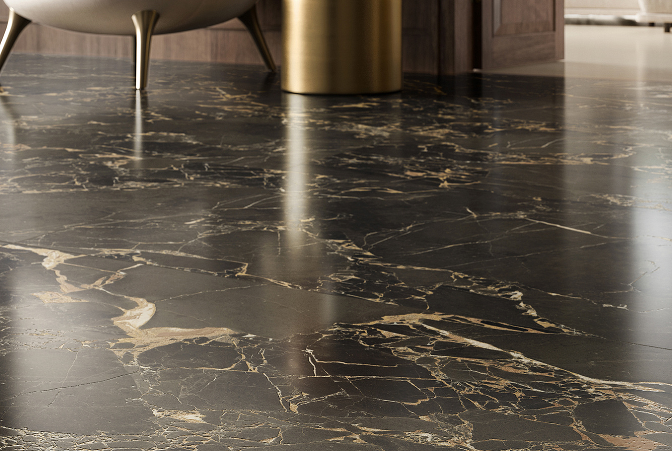 Doro вдохновлён мрамором Emperador. В его глубокой черноте золотые прожилки создают завораживающие вибрации, обеспечивая притягательную, почти магнетическую элегантность.